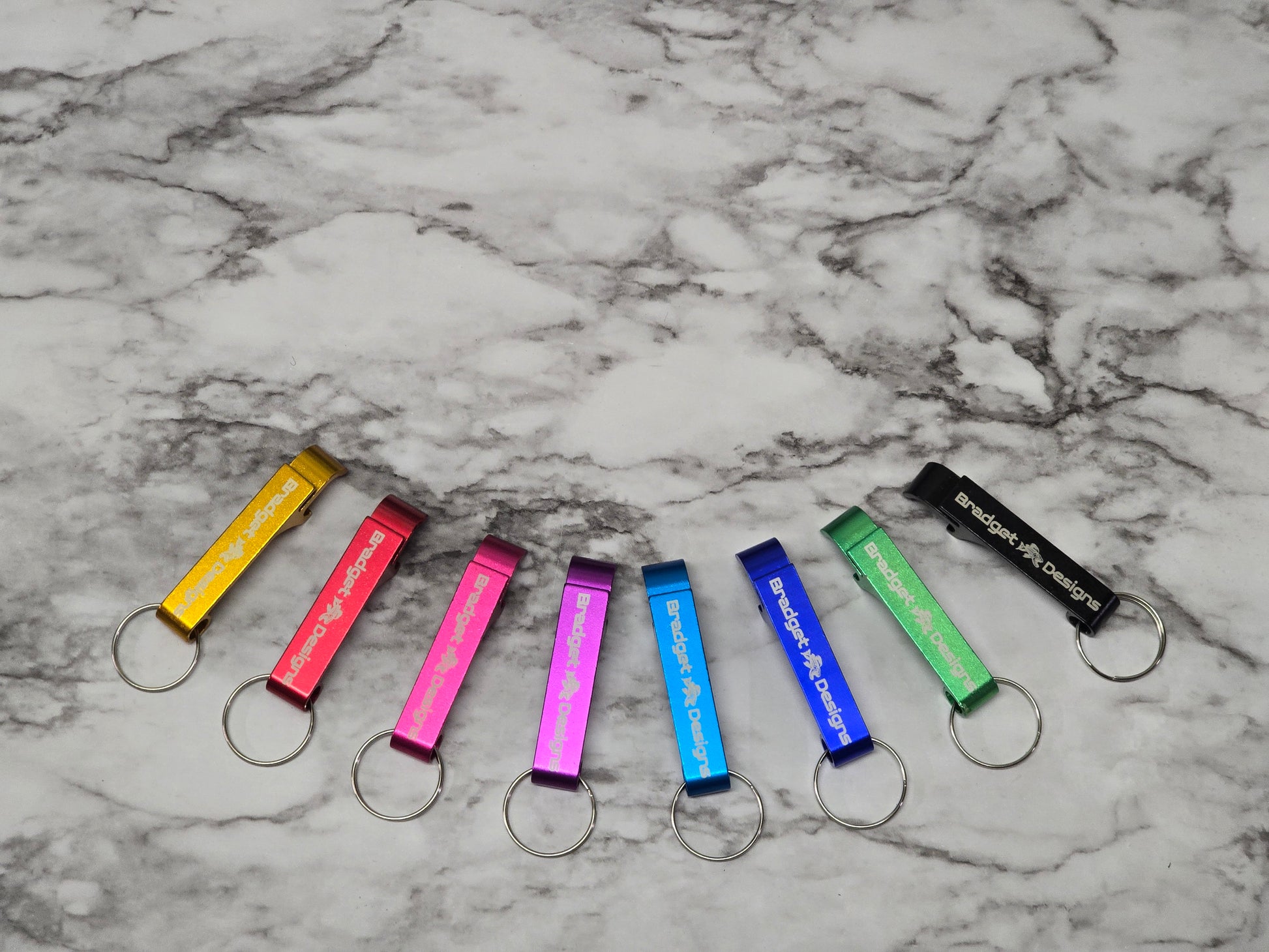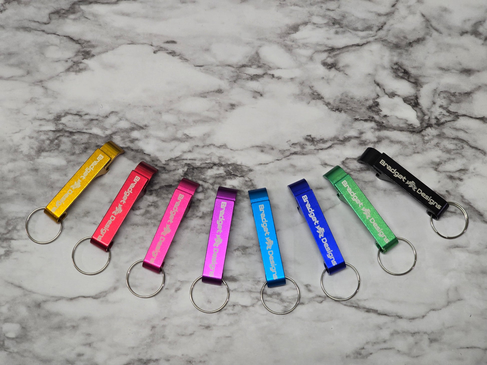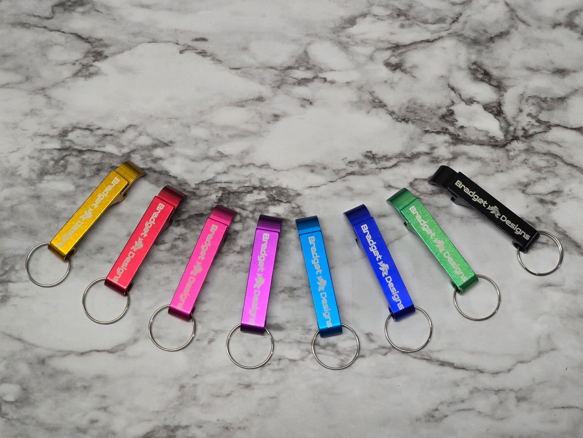 These bottle openers are anodized aluminum in various colors.